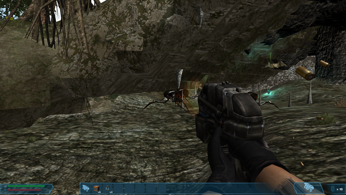 This is the best part, you leave your outpost to enter a cave full of arachnids, for some old school FPS. gun #1 is your standard pea shooter - infinite ammo in the demo, and gun #2 directs your miner nanites to destroy the terrain (it won't be the same gun in the alpha ! ). You can see it happen here