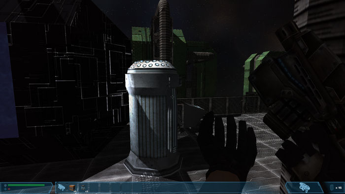 One more FPS scene, inside a station with a force field and few ships parked. Go near the turrets and they will start to shoot you - exploding all the crates in their way. Try to make turrets explode like in the picture!